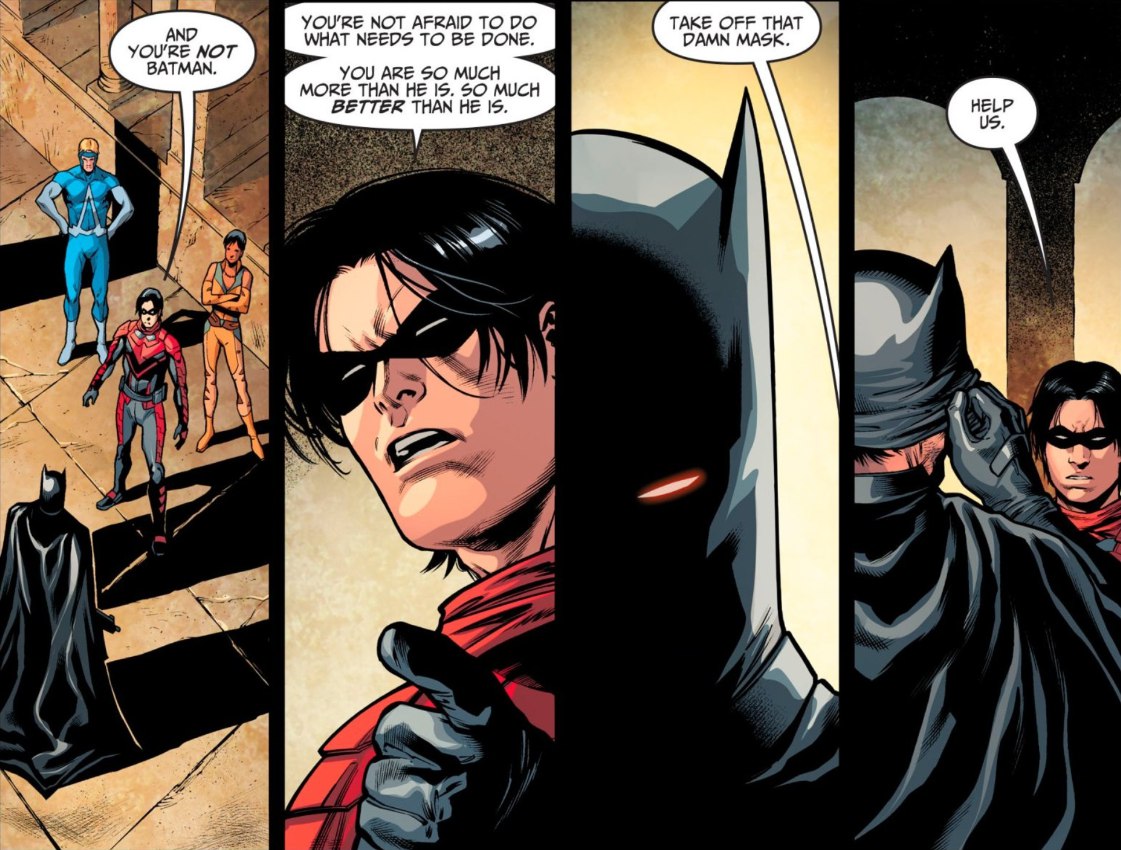 Дэмиан: И ты НЕ Бэтмен. Ты не боишься делать то, что нужно. Ты намного большее чем он. Ты намного ЛУЧШЕ чем он. Сними эту чёртову маску. Помоги нам.