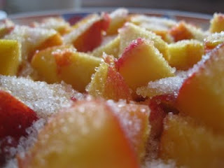 Решила сварить нектариновый конфитюр - нахлынуло "французское настроение" *_* Для начала засыпала кусочки нектаринов сахаром - это нереально красиво, мне кажется.